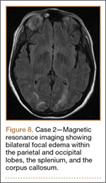 Development and Diagnosis of PRES. The patient was ambulatory with physical therapy and a walker on postoperative day 1. Her albumin levels were noted to be decreased postoperatively (28 mg/mL; normal, >35 mg/mL). She developed intermittent hypertensive episodes and experienced transient peripheral vision loss. After her ophthalmologic symptoms cleared, she was discharged and transferred to a rehabilitation facility on postoperative day 9. Eleven days later, the patient was emergently readmitted for a deep spine wound infection after an onset of wound swelling and fever. She underwent irrigation and débridement of the spine wound with an estimated blood loss of 400 mL. The patient continued to have fevers and was placed on ciprofloxacin and vancomycin, which was changed to levofloxacin on postoperative day 5. Elevated creatinine was noted, and the patient was diagnosed with acute renal failure. On postoperative day 7, oxacillin therapy was commenced. After her cultures grew methicillin-resistant Staphylococcus aureus, a peripherally inserted central catheter line was placed on postoperative day 9. As a result of nausea and constipation, the patient received feeding tubes on postoperative day 11. Additionally, she was diagnosed with a pleural effusion on postoperative day 14. Although her creatinine levels were decreasing, she continued to experience intermittent hypertensive episodes with a mean peak systolic blood pressure of 148 mm Hg. On postoperative day 15, she had a seizure and again developed visual loss. The patient was lethargic and followed only simple commands. She moved all extremities and withdrew symmetrically to noxious stimuli. Upon emergent imaging, head CT showed posterior subcortical white matter hypodensity within the occipital and parietal lobes bilaterally (Figure 7). MRI showed focal regions of symmetric hemispheric edema involving the parietal and occipital lobes in a predominantly subcortical white-matter distribution. Additionally, extensive involvement of the splenium and of the corpus callosum, left greater than right, was observed (Figure 8).