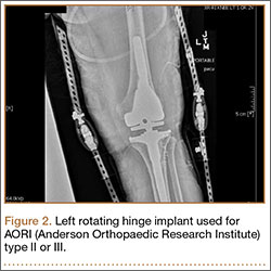 Many patients who undergo revision TKA can be managed with a posterior stabilizing or nonlinked constrained design. However, in patients who present with severe ligamentous instability and bone loss (AORI type II or III), a rotating hinge prostheses, or highly constrained device, is often recommended (Figure 2).18 By using a rotating mobile-bearing platform, this prosthesis permits axial rotation through a metal-reinforced polyethylene-post articulation in the tibial tray. In addition, it involves use of modular diaphyseal-engaging stems and diaphyseal sleeves, which allow for the bypass of bony defects and areas of bone loss (Table 2).