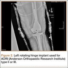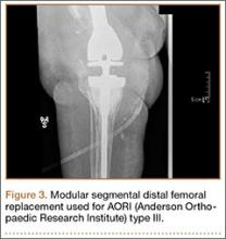 Segmental arthroplasty prostheses, which typically are end-of-the-line revision TKA options, are applicable only in cases of extensive bone loss (more than can be treated with allografts or augments; AORI type 3), complete ligamentous disruption/absence, loss of periprosthetic soft tissue, and multiple previous revision procedures (Figure 3). Despite the limited indications for these prostheses, they yield quick return to function without graft nonunion or resorption, and they augment ingrowth/ongrowth. Furthermore, the next surgical option could be fusion or amputation. When failures were specifically evaluated for aseptic loosening across 4 studies, the survival rate ranged from 83% to 99.5%, with the most frequent complication being infection (up to 33% in one series).6,19-21