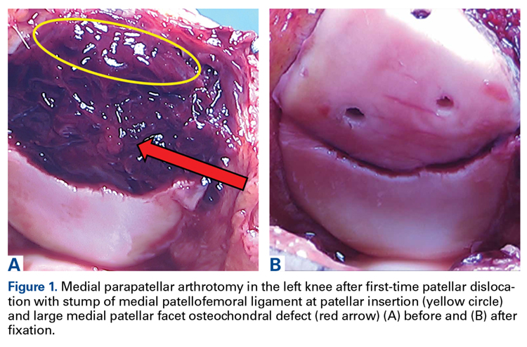 Although optimal management of first-time patellar dislocation continues to be a topic for debate, the frequency of recurrent instability,7,27 particularly in young patients, has led some to advocate early surgical management.9,28 A clear indication for early operative intervention is the presence of a large osteochondral lesion that can undergo fixation or is causing persistent mechanical symptoms with recurrent effusion (Figures 1A, 1B).