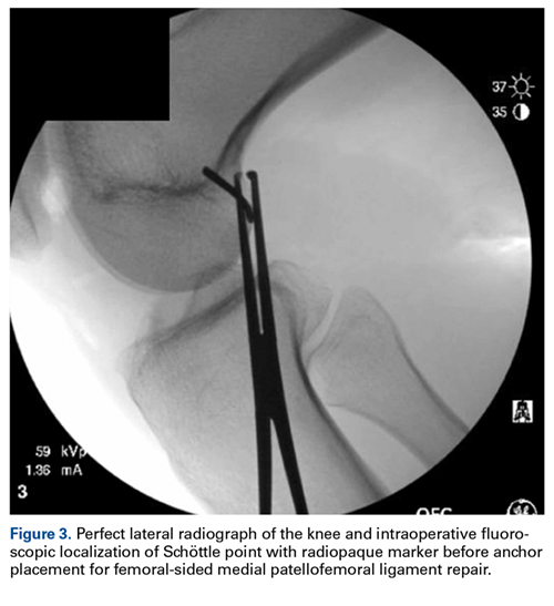 Although large osteochondral lesions may be visible on plain radiographs, MRI can be considered because of the relatively high incidence of osteochondral lesions in this population.21 In addition, MRI best determines the location and the extent of MPFL injury when early surgical intervention is being considered after discussion with the patient, or in cases of a concomitant osteochondral lesion.20 MPFL repair is best indicated in a young patient with a first-time patellar dislocation and a patella- or femoral-based bony avulsion or isolated patella- or femoral-based rupture (Figure 2). However, in a patient with a multifocal intrasubstance ligamentous injury, and in a high-level athlete being considered for surgery, MPFL reconstruction may provide more reliable outcomes.11,29Numerous open and arthroscopic MPFL repair techniques have been described.10,30-33 Nevertheless, comparative studies are limited, and the greatest debate about MPFL repair continues to be appropriate indications. Arthroscopic MPFL repair can be technically demanding and can fully visualize only patella-based injuries. In addition, all-arthroscopic repair techniques may place suture material in the joint, which causes concern regarding suture irritation. As a result, the majority of MPFL repair techniques described in the literature use an open approach, which typically includes a 4-cm to 5-cm longitudinal incision along the medial aspect of the patella. Sharp dissection is carried down through the medial retinaculum to the underlying joint capsule. The plane between the medial retinaculum and the underlying joint capsule is bluntly developed posteriorly until the medial epicondyle and the adductor tubercle are palpated. For a patella-based rupture, the MPFL is defined within layer 2, and 2 suture anchors are placed within the superior third of the patella. Although there are other patellar fixation methods, suture anchors provide adequate fixation with minimal risk of iatrogenic patellar fracture. With anchors in place, horizontal mattress sutures are placed in the stump of the MPFL. For femoral-based ruptures, the same surgical exposure is used to identify the MPFL. However, depending on the size of the incision and the mobility of the tissue, a second incision can be made posterior and parallel to the first—best achieved using a spinal needle to fluoroscopically localize Schöttle’s point.16 An incision is made in line with the spinal needle, and dissection is continued down to the previously developed extracapsular plane. Under fluoroscopic guidance (Figure 3), 1 or 2 suture anchors are placed at Schöttle point, and horizontal mattress sutures are placed through the avulsed MPFL femoral origin.