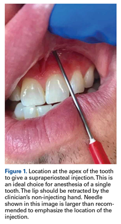 Direct trauma can cause instability without displacement (subluxation) or complete displacement of the tooth from its alveolar socket (avulsion).23 An avulsed tooth should be handled by the crown to avoid further damage to the root and periodontal ligament.16,24 The tooth should be rinsed gently with saline and reimplanted in its socket, ideally within 5 to 10 minutes,23with the athlete biting down gently on gauze to hold the tooth in place. A 1-mL supraperiosteal infiltration of 1% or 2% lidocaine hydrochloride (1:100,000 epinephrine) can be given into the apex of the tooth being anesthetized (Figure 1).