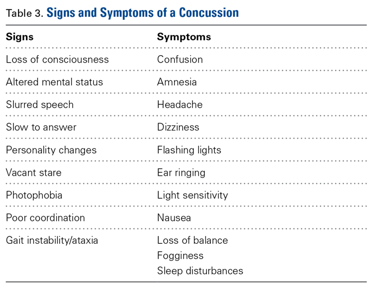 If reimplantation is not possible, the avulsed tooth should be transported in saline, saliva, or milk for emergent dental care.16 If the tooth is driven into the alveolar socket, it should not be repositioned acutely but referred for dental evaluation.11A player with a dental injury should be immediately evaluated for airway obstruction, and the injured area should be washed with sterile water and dabbed with gauze.23 Dental injuries are often permanent and can cause complications later in life.19 Therefore, it is imperative to manage dental injuries appropriately, especially as reimplanting a tooth within 30 minutes results in 90% probability of tooth survival, whereas a 2-hour delay reduces tooth survival to <5%.12 Return to play should be individualized. For completely avulsed teeth that cannot be reimplanted, the player can return to play (with mouth guard protection) within 48 hours as long as there are no bone fractures.24 Players who undergo reimplantation and splinting of avulsed teeth should wait 2 to 4 weeks before returning to play.23 Use of mouth guards and face protection is directly associated with prevention of dental injuries; these protective devices should be worn in practice and competition.16,19,23Concussions