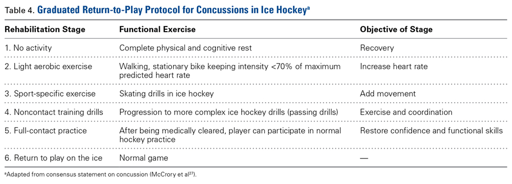 Initial treatment involves a period of physical rest and relative cognitive rest. Acute worsening of symptoms warrants urgent imaging to rule out a subdural or subarachnoid bleed. Once a player is symptom-free, a graded return-to-play protocol should be followed (Table 4).