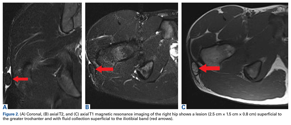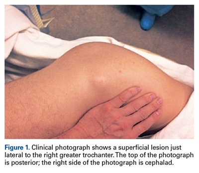 Physical examination revealed a palpable mass over the lateral aspect of the hip, over the greater trochanter. The mass, about 3 cm in diameter (Figure 1), was mobile in a subcutaneous pocket, consistent with an old ML lesion.