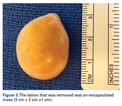 For the surgery, the patient was positioned in the lateral decubitus position with his right hip facing up. The right hip and thigh were prepared and draped in sterile fashion. An incision 4 cm in length was made directly over the mass, along the lateral aspect of the hip, over the greater trochanter. The incision was taken through skin and subcutaneous tissue down to the deep fascia. The fascia was incised longitudinally in line with the overlying skin incision. As soon as the incision was made through the fascia, the mass was easily seen. The 3-cm × 2-cm × 1-cm mass was free, not attached to any underlying soft tissue (Figure 3).