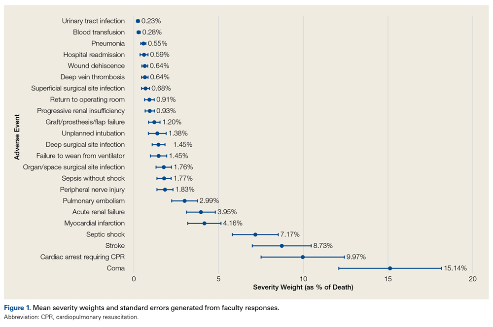 This study had several limitations. Most significantly, the generated severity weights were based on the surgeons’ subjective perceptions of severity, not on definitive assessments of the impacts of specific AEs on actual patients. We did not query the specialists who treat the complications or who present data on the costs and disabilities that may arise from these AEs. In addition, to develop our severity weighting scale, we queried faculty at only 2 institutions. A survey of surgeons throughout the United States would be more representative and would minimize selection bias. This is a potential research area. Another limitation is that scoring was subjective, based on surgeons’ perceptions of patients—in contrast to the Global Burden of Disease project, in which severity was based more objectively on epidemiologic data from >150 countries.