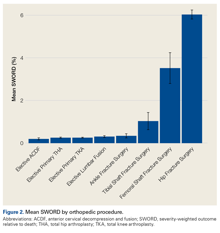 Among ACS-NSQIP patients, mean SWORD ranged from 0.2% (elective anterior cervical decompression and fusion) to 6.0% (hip fracture surgery) (Figure 2).