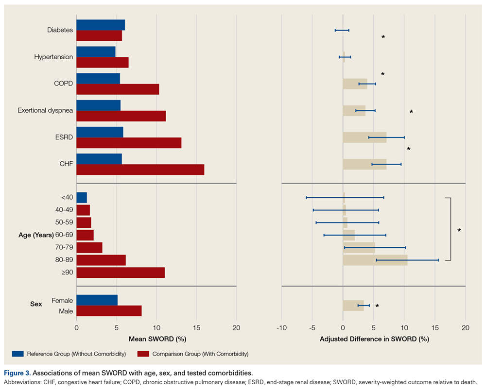 Mean SWORD was associated with procedure type both before (P < .001) and after (P < .001) controlling for demographic and comorbidity differences between populations. Among ACS-NSQIP patients having hip fracture surgery, mean SWORD was independently associated with older age, male sex, and 4 of 6 tested comorbidities (Ps < .05) (Figure 3).Discussion