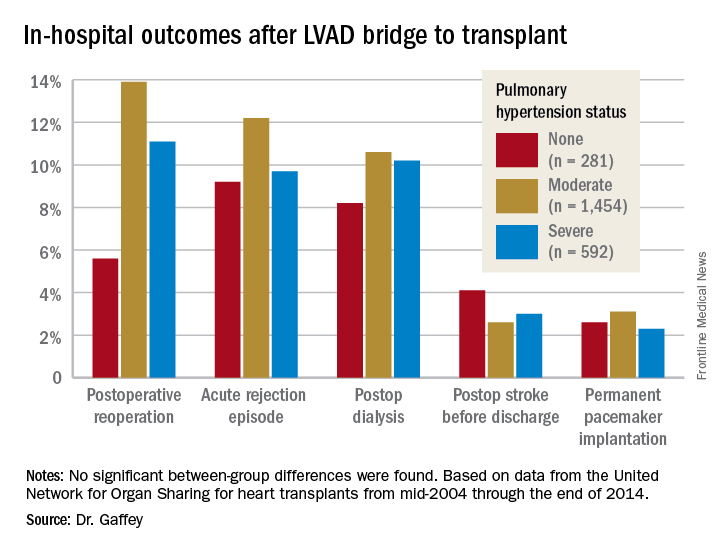 The review turned up 3,951 heart transplant recipients who had been bridged to transplant with an LVAD. Dr. Gaffey and her coinvestigators divided them into three groups: 281 patients without pretransplant PH; 1,454 with moderate PH as defined by 1-3 Wood units; and 592 with severe PH and more than 3 Wood units.