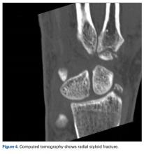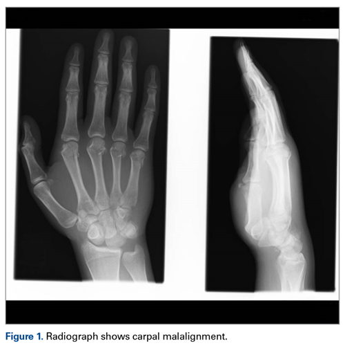 A fit and healthy 30-year-old male software professional fell down stairs, landed on his nondominant right hand, and sustained a high-energy wrist injury. The patient also sustained a concussion, without focal neurologic deficit, and was unable to recall the exact mechanism of the wrist injury (there were no other witnesses). Radiographs of the right wrist in the emergency department showed only a nondisplaced fracture of the neck of the second, third, fourth, and fifth metacarpals and a nondisplaced fracture of the radial styloid.
