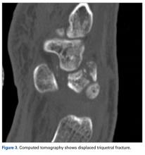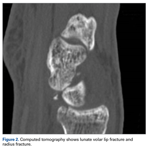 Perilunate injuries have been missed in busy emergency departments and orthopedic practices. An estimated 25% of such injuries can be missed on initial presentation. 8 In the present case, fracture of the radial styloid provided a clue to possible more complex carpal injuries involving the scaphoid, lunate, or scapholunate ligament, as Graham 4 suggested with the concept of the “transverse pattern” of force transmission. In this case as well, the injury was initially missed, and its extent became evident only with CT. Therefore, emergency teams should have a very low threshold for suspecting and evaluating high-energy wrist injuries.