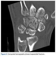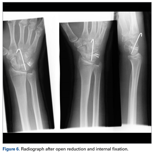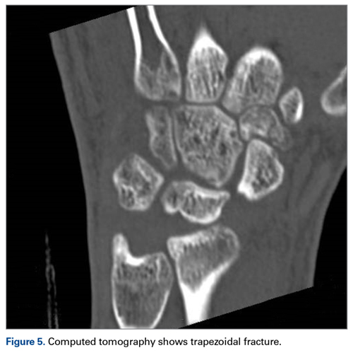 Later, however, the hand surgery team evaluated the radiograph as well as computed tomography (CT) scans and found a translunate, transradial, transtriquetral, transtrapezoid perilunate dislocation of the wrist with multiple metacarpal neck fractures ( Figures 1-5 ).The next day, with the patient under general anesthesia, an attempt to reduce the perilunate dislocation by manipulation was unsuccessful. Open reduction and internal fixation (ORIF) were performed through a dorsal approach; the perilunate dislocation was reduced and stabilized with lunocapitate 1.2-mm Kirschner wire (K-wire). The scapholunate and lunotriquetral ligaments were found to be intact, and the significantly displaced triquetral fracture was treated with internal fixation involving 2 minifragment screws ( Figure 6 ).