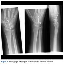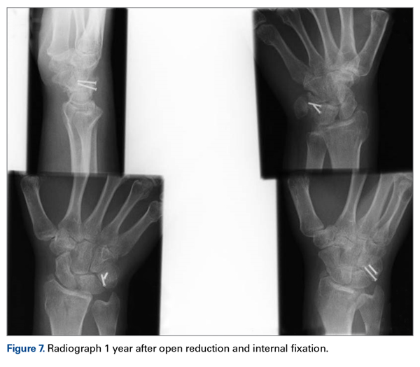 The other carpal fractures were nondisplaced and fixation was not required. The wrist was immobilized in a full cast. At 4 weeks, K-wire and cast were removed and the wrist mobilized under supervision of a hand therapist. Satisfactory radiologic union was noted at 6 weeks. Further follow-up was arranged at 3 months, 6 months, and 1 year ( Figure 7 ). At 6 months, the patient had full range of motion and good grip strength. At 12 months, the outcome was excellent (Mayo Wrist Score = 90).Discussion