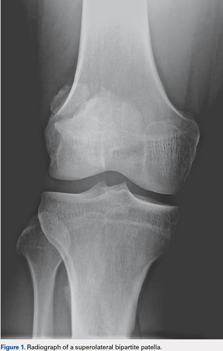 Of the 197 patients, only 1 was found to have a multipartite patella (prevalence, 0.5%). This 37-year-old male patient showed a right bipartite patella located in the superior-lateral aspect (Figure 1).
