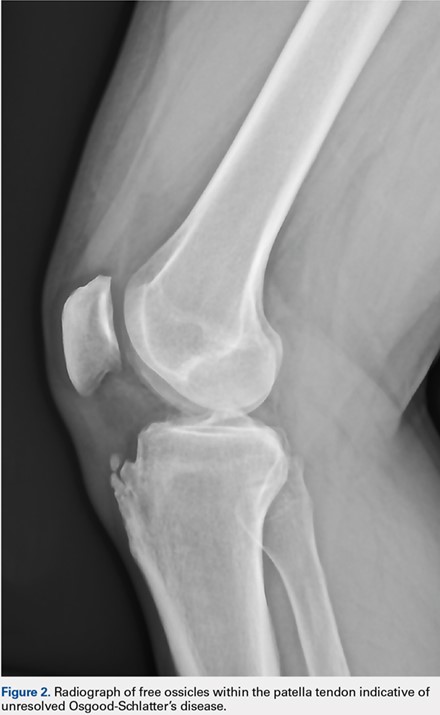 Four patients had free ossicles within the inferior patellar tendon consistent with unresolved Osgood-Schlatter’s disease (prevalence, 2.0%) (Figure 2). All 4 patients were male, which is consistent with the higher incidence of Osgood-Schlatter’s disease in males than in females. The average age of these patients was 27.5 years (range, 22-33 years).