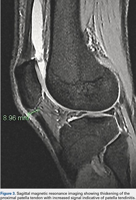 The most common extensor mechanism pathology present on preoperative imaging was proximal patella tendon thickening suggestive of patella tendinopathy. Thickening of the proximal portion of the patellar tendon was present in 15 of the 197 MRIs (prevalence, 7.6%) (Figure 3). The average width of this thickening was 8.49 mm (7.17-10.17 mm), and the average age of patients with radiographic evidence of patellar tendinopathy was 29.9 years (range, 20-43 years). Gender distribution was predominantly male (14 males, 1 female). Details of all extensor mechanism pathologies found are provided in the Table.