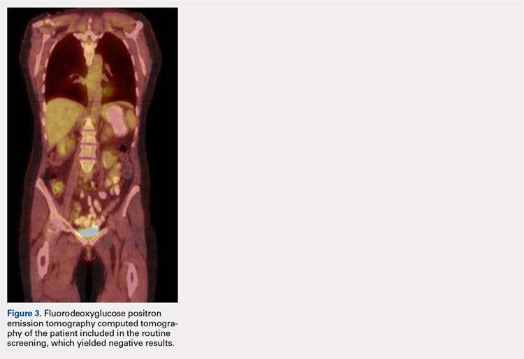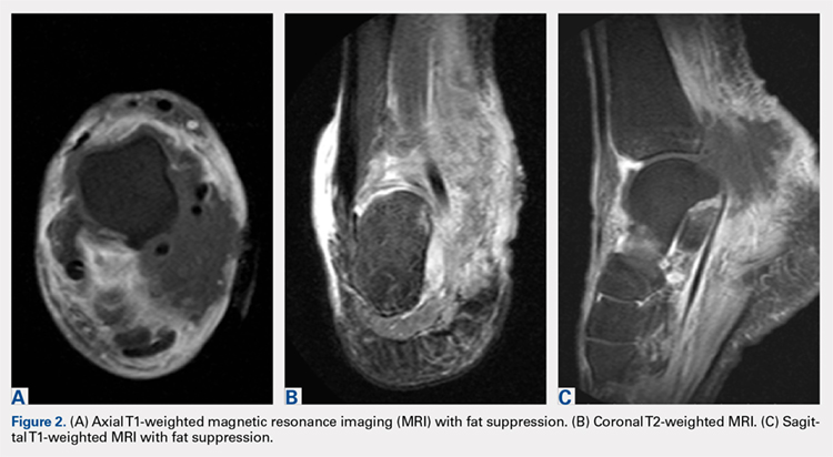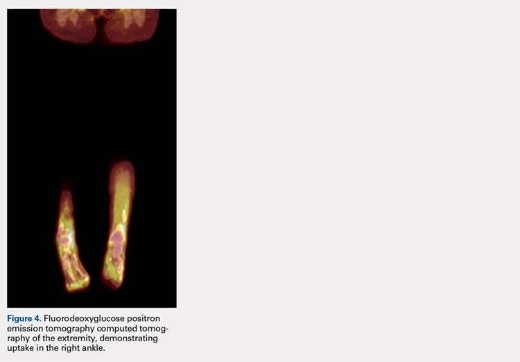 MRI of the foot and ankle was reviewed and demonstrated a large soft-tissue mass over the medial aspect of the ankle extending posteriorly to engulf the medial flexor tendons and medial neurovascular bundle (Figures 2A-2C). Interestingly, the radiologist’s report only mentioned a “large region of devitalized tissue underlying the known medial ankle ulcer which extended to the tibiotalar and subtalar joints and bone marrow changes in the talus most compatible with osteomyelitis.” FDG PET-CT images from the patient’s past 2 years were reviewed, and the radiologist was contacted to confirm the negative findings. Unfortunately, FDG PET-CT performs no routine imaging below the elbow or knee when evaluating for this particular malignancy (Figure 3).At presentation, our differential diagnosis included recurrence of the malignancy, secondary malignancy, infection, and inflammatory disease. After a lengthy discussion with the patient and consultation with our institution’s musculoskeletal oncologist, the decision was made to perform a right-ankle mass biopsy and marginal excision with wound irrigation and débridement and tarsal tunnel release.