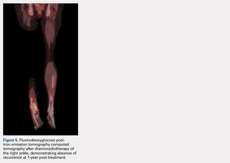 The patient was placed on her second cycle of chemoradiotherapy and again showed complete remission. At over 1-year follow-up, the patient’s wound had completely healed, and FDG PET-CT of the extremity was negative for ENKTL recurrence (Figure 5). At present, the patient’s medical oncologists recommend a stem cell transplant as the patient exhibited 2 positive responses to chemoradiotherapy.DISCUSSION