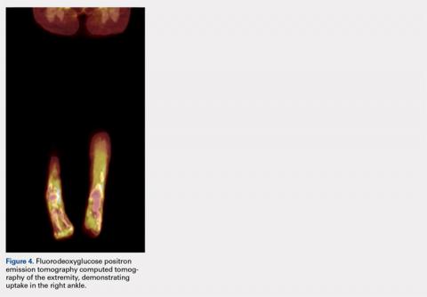 ENKTL is an uncommon form of lymphoma and is exceedingly rare in Caucasian females.1-3 Although the patient’s primary occurrence was in the nasal cavity, recurrence in the foot and ankle must still be described.7,8 To our knowledge, this article is one of the first published cases of a patient who developed a rare-recurrence ENKTL about the foot and ankle. Occurrence in extremities is extremely rare that the staging protocol does not include FDG PET-CT of these areas. The patient’s “negative” scans led many providers to neglect the symptoms in her right ankle until the lesion had ulcerated through the skin. If one would have relied on imaging reports and outside records alone, the diagnosis would have been delayed longer or missed all together. This case illustrates the importance of a thorough medical history and personal review of imaging studies, and how a systematic approach can produce the correct diagnosis for any unknown lesion. Furthermore, this case may prompt oncologists to consider obtaining whole-body FDG PET-CT when evaluating for recurrence in patients.