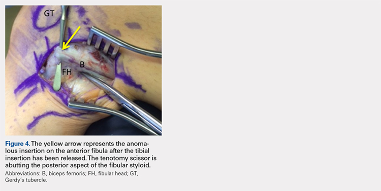 Date and colleagues4 described a similar anatomical anomaly as with our patient, whom after the release of tibial insertion, snapping was still observed, thus requiring the release of anterior fibular insertion. They noted the necessity of suturing the accessory limbs onto the periosteum of the fibular head to achieve a stable biceps femoris.