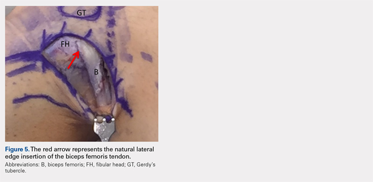 Upon exploration of the biceps femoris insertion, the accessory anterolateral tibial insertion was readily identified (Figure 3). Notably, the expected normal lateral edge insertion was thickened and extended beyond the lateral edge, distal, and anterior on to the fibular head (Figure 4). The anterolateral tibial band was released first. However, the snapping remained evident. The thickened anterior fibular accessory band was then released back to its normal, lateral edge, and at this point, no further snapping was observed with deep flexion of the knee. Inspection of the remaining posterolateral and lateral edge insertion demonstrated a healthy, 1-cm thick tendinous insertion. The accessory slips were completely excised, and the incision was closed without any additional repair or re-insertion (Figure 5). The patient presented no complications postoperatively. He was allowed to bear weight as tolerated and was limited to stretching and gravity resistance training for 4 weeks. At 1 month, the patient was released to progress back to full activity. By 8 weeks postoperative, he remained free of snapping and resumed his regular running routine and military duties without restriction or pain.