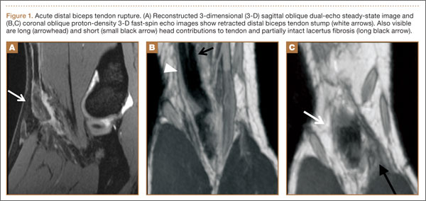 Physical examination revealed distortion of the biceps with a palpable defect in the right elbow consistent with a complete biceps tendon rupture. This was confirmed on MRI, which showed avulsion of the distal biceps tendon from its insertion on the radius. There was 4 cm of proximal retraction of the tendon, which was kept at the level of the joint line by a partially intact lacertus fibrosis (Figure 1).