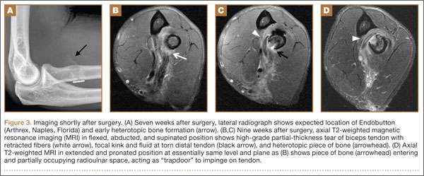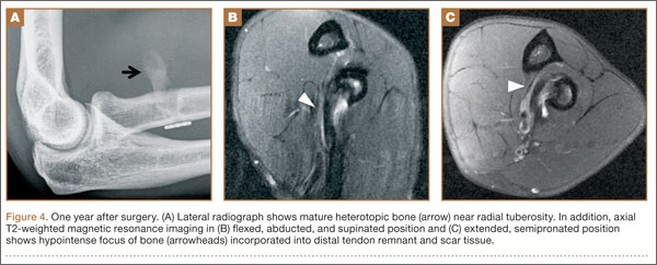 Retearing after repair of the distal biceps tendon is rare.1 Heterotopic ossification (HO) is also considered uncommon, though reported rates in the literature vary widely, depending on repair and follow-up methods.1-3