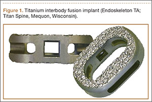 A new titanium interbody fusion implant (Endoskeleton TA; Titan Spine, Mequon, Wisconsin) preserves the endplate and has an acid-etched titanium surface for osseous integration and a wide central aperture for bone graft (Figure 1). Compared with earlier titanium implants, this design may allow for more accurate CT imaging and fusion assessment. We conducted a study to determine the interobserver reliability of using CT to evaluate bone formation and other radiographic variables with this new titanium interbody device.