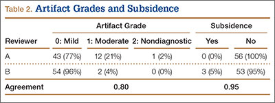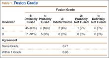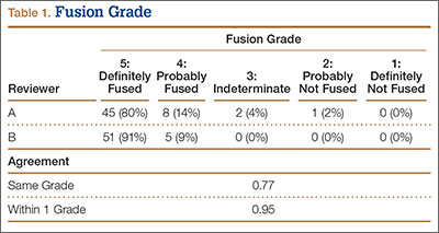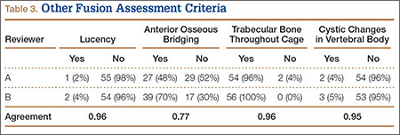 The radiologists agreed on 345 of the 392 data points reviewed (κ = 0.88). Interobserver agreement results for the fusion criteria are listed in Tables 1 and 3. Interobserver agreement was 0.77 for overall fusion grade, with the radiologists noting definite fusion (grade 5) in 80% and 91% of the levels (Table 1). Other radiographic criteria are listed in Tables 2 and 3. Interobserver agreement was 0.80 for degree of artifact, 0.95 for subsidence, 0.96 for both lucency and trabecular bone, 0.77 for anterior osseous bridging, and 0.95 for cystic vertebral changes.