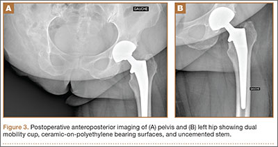 We use DM cups for 2 patient cohorts: first, for all patients older than 75 years because, in this age group, the risk of dislocation is higher than the risk of revision for wear-induced lysis; and second, in younger patients with any neuromuscular, cognitive, or mechanical risk factors that would excessively increase the risk of dislocation. This reflects the balance of risks in arthroplasty, with the ever-present trade-off between polyethylene-induced osteolysis and stability. Dislocation of the remaining sound limb for this young, active, agile patient would be a catastrophic complication. Given our patient’s risk factors for dislocation—female, an amputee with a high risk of falling, high body mass index, and lack of a contralateral limb to restrict adduction—the balance of risks favored hip stability over wear. We chose, therefore, a DM cup, using a ceramic-head-on-polyethylene-insert surface-bearing combination.