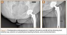 Hip and knee OA in the residual limb is more common for amputees than for the general population.2,3 THA for OA in amputees has been reported after below-knee amputation in both the ipsilateral and the contralateral hip.4 A true hip disarticulation is a rarely performed radical surgical procedure, involving the removal of the entire femur, and is most often related to surgical oncologic treatment or combat-related injuries, both being more common in younger people. Like many patients who have had a hip disarticulation,5 our patient declined a prosthesis, finding the design cosmetically unappealing and uncomfortable, in favor of crutch-walking. This accelerated wear of the remaining hip, and is a sobering reminder of the high demand on the bearing surfaces of the implants after her procedure.