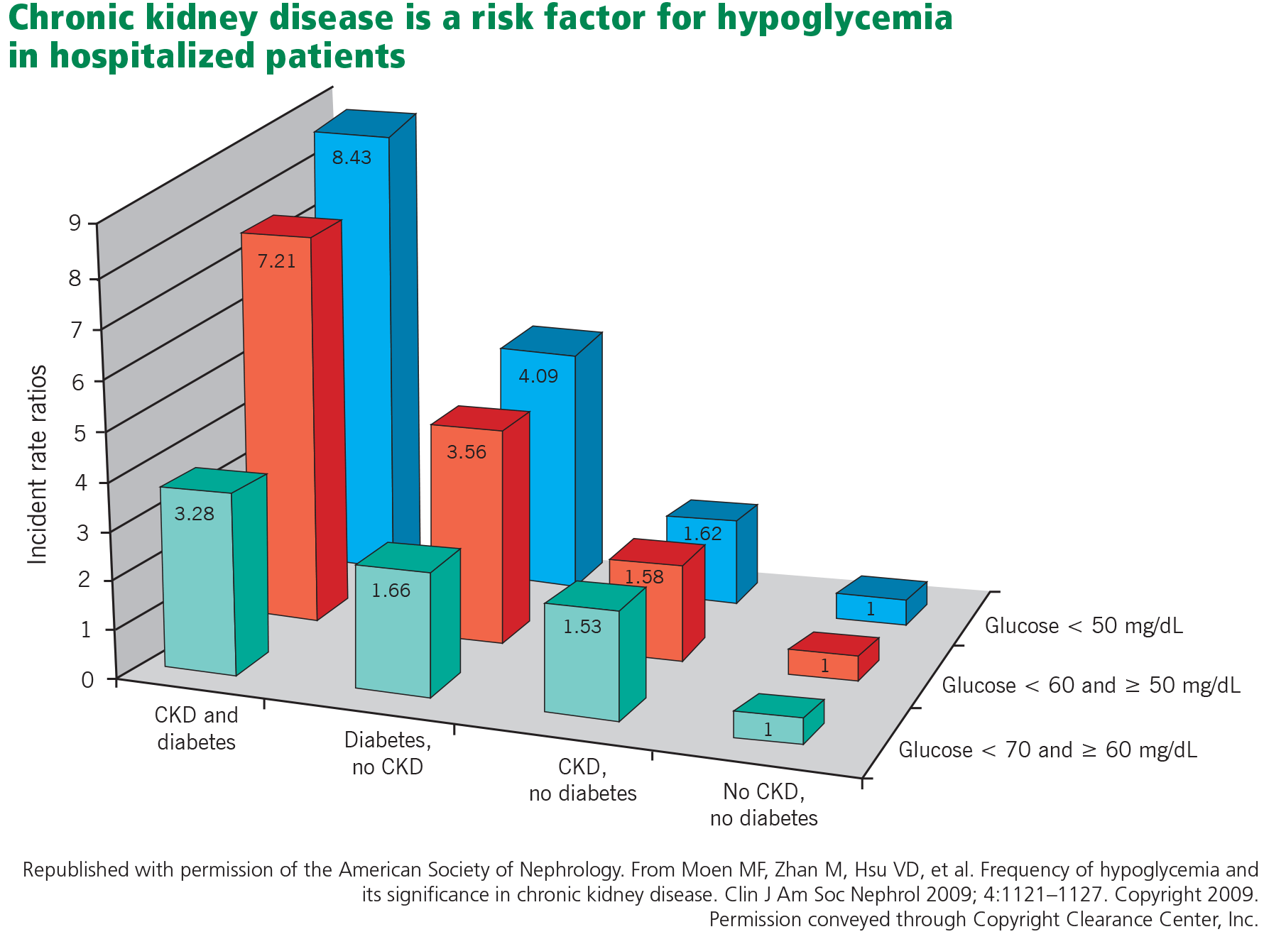 Moen et al12 found that the incidence of hypoglycemia was significantly higher in patients with CKD (estimated glomerular filtration rate [GFR] < 60 mL/min) with or without diabetes, and that patients with both conditions were at greatest risk (Figure 1). Multiple factors contribute to the increased risk of hypoglycemia: patients with advanced CKD tend to have poor nutrition, resulting in reduced glycogen stores, and a smaller renal mass reduces renal gluconeogenesis and decreases the elimination of insulin and oral antidiabetic agents.