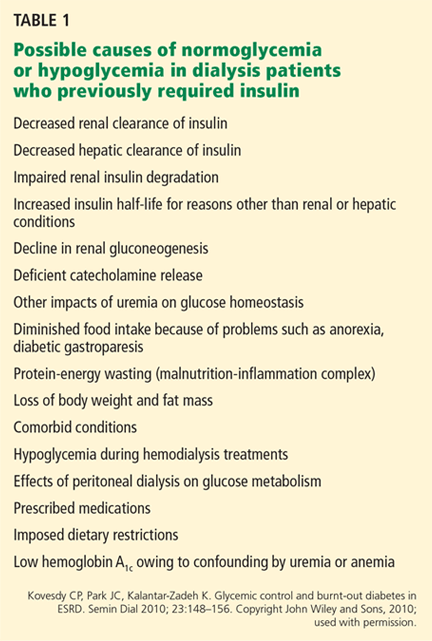 Paradoxically, patients with end-stage renal disease and type 2 diabetes often experience altered glucose homeostasis with markedly improved glycemic control. They may attain normoglycemia and normalization of hemoglobin A1c, a condition known as “burnt-out” diabetes. Its precise mechanism is not understood and its significance remains unclear (Table 1).17