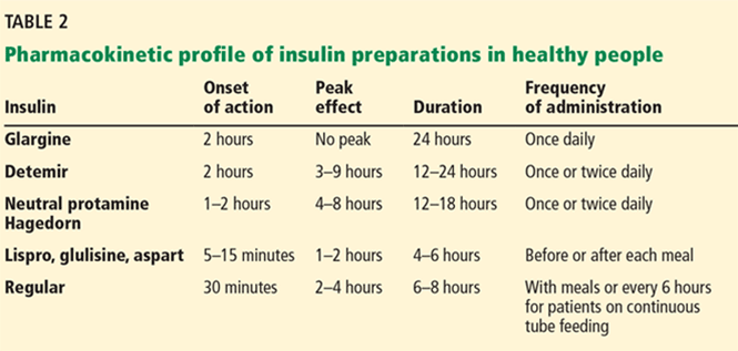 Optimizing glycemic control requires an understanding of the altered pharmacokinetics and pharmacodynamics of insulin in patients with diabetic nephropathy. Table 2 shows the pharmacokinetic profiles of insulin preparations in healthy people. Analogue insulins, which are manufactured by recombinant DNA technology, have conformational changes in the insulin molecule that alter their pharmacokinetics and pharmacodynamics. The rapid-acting analogue insulins are absorbed quickly, making them suitable for postprandial glucose control.