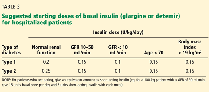 CKD may reduce insulin clearance. Rave et al32 reported that the clearance of regular human insulin was reduced by 30% to 40% in patients with type 1 diabetes and a mean estimated GFR of 54 mL/min. They found that the metabolic activity of insulin lispro was more robust than that of short-acting regular human insulin in patients with diabetic nephropathy. In another study, patients with diabetes treated with insulin aspart did not show any significant change in the required insulin dosage in relation to the renal filtration rate.34 Biesenbach et al33 found a 38% reduction in insulin requirements in patients with type 1 diabetes as estimated GFR decreased from 80 mL/min to 10 mL/min. Further studies are required to better understand the safety of insulin in treating hospitalized patients with diabetes and renal insufficiency.