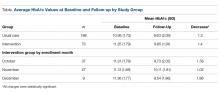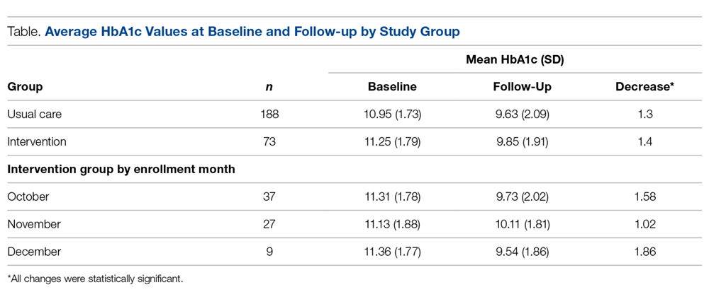 A total 271 patients with HbA1c above 9 were included in the analysis: 71 in the intervention group and 188 in the usual care group. The intervention group was further differentiated by month of enrollment: October (n = 37), November (n = 27), and December (n = 9). Mean patient age in the overall sample was 51.6 years.