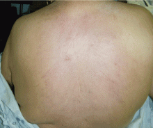 A: The correct answer is scleredema diabeticorum, a common, underdiagnosed skin manifestation of uncontrolled diabetes mellitus seen in 2.5% to 14% of diabetic patients.1,2 It most often presents with the insidious onset of painless induration and nonpitting thickening of the skin, predominantly on the upper back and neck. Biopsy of the skin usually reveals thickening of the dermis with deposition of collagen and hyaluronic acid without an inflammatory infiltrate.3