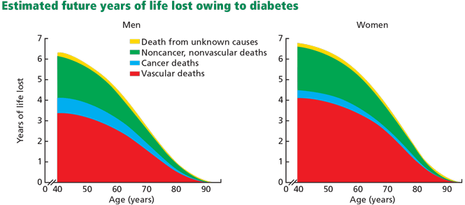 Figure 1. The Emerging Risk Factors Collaboration found that 50-year-old people with diabetes died an average of 6 years sooner than their counterparts without diabetes. People with known preexisting cardiovascular disease at baseline were excluded from the analysis shown here.