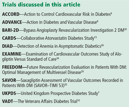 ACCORD.9 The Action to Control Cardiovascular Risk in Diabetes trial went one step further. This trial randomized more than 10,000 patients with type 2 diabetes to receive either intensive therapy (targeting hemoglobin A1c ≤ 6.0%) or standard therapy (hemoglobin A1c 7.0%–7.9%). At 1 year, the mean hemoglobin A1c levels were stable at 6.4% in the intensive-therapy group and 7.5% in the standard-therapy group.